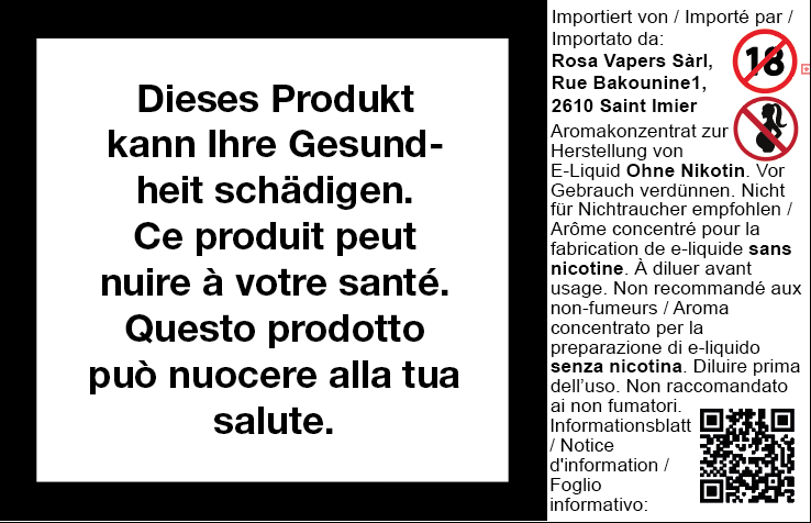 | Version | 20 ml aroma, 60 ml nic 3.3mg (20ml aroma + 1x10ml 20mg + 3x10ml 0mg), 60 ml nic 6.6mg (20ml aroma + 2x10ml 20mg + 2x10ml 0mg), 60 ml nic 9.9mg (20ml aroma + 3x10ml 20mg + 1x10ml 0mg), 60 ml nic 13.3mg (20ml aroma + 4x10ml 20mg) |